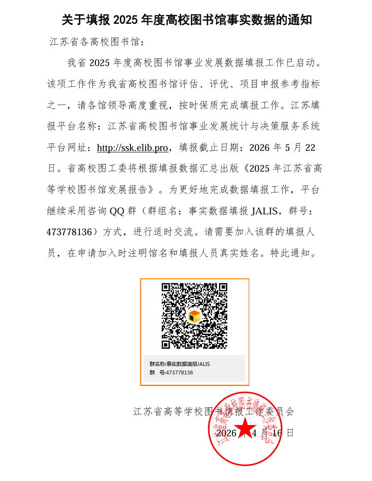 关于填报2025年度江苏省高校图书馆事实数据的通知